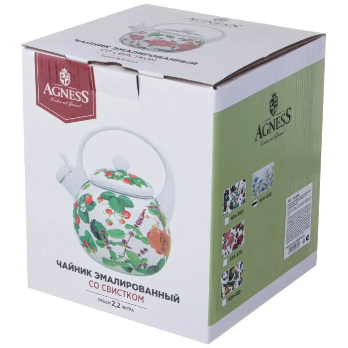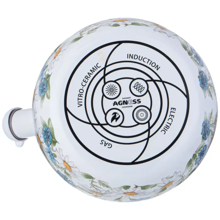 Эмалированный чайник со свистком серии Sentiment от Agness предназначен для кипячения воды и отличается универсальностью в использовании. Подходит для всех типов плит, включая индукционные, благодаря специальному дну. Удобная ненагревающаяся ручка с клапаном облегчает наливание воды.