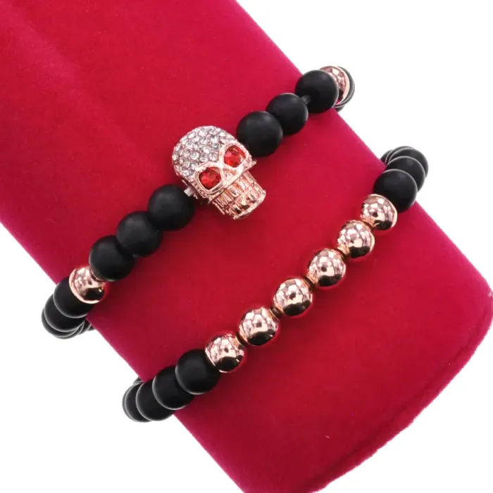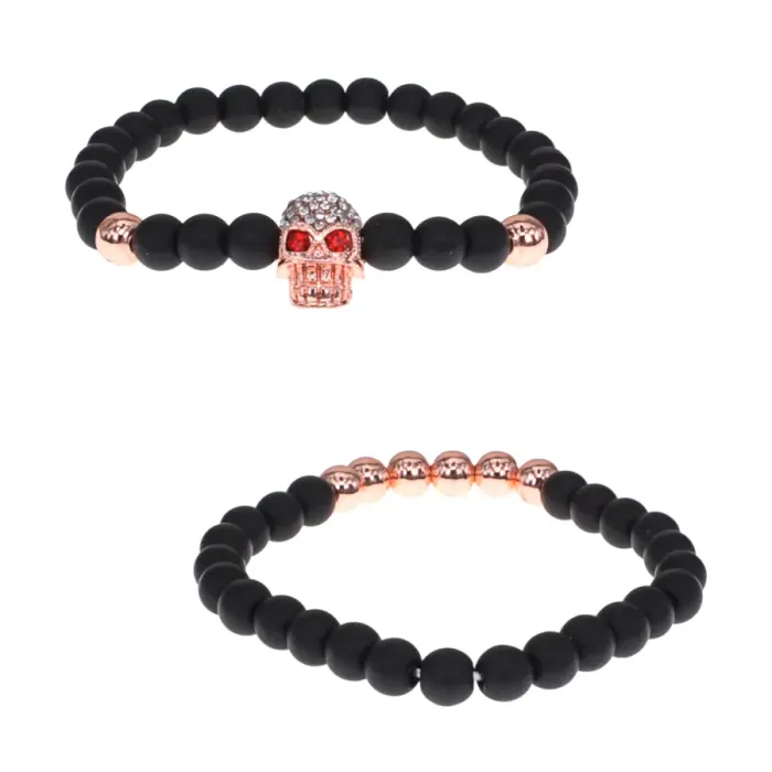 Парные стрейч-браслеты с бусинами из металла и синтетического шунгита, с коннектором в виде черепа.