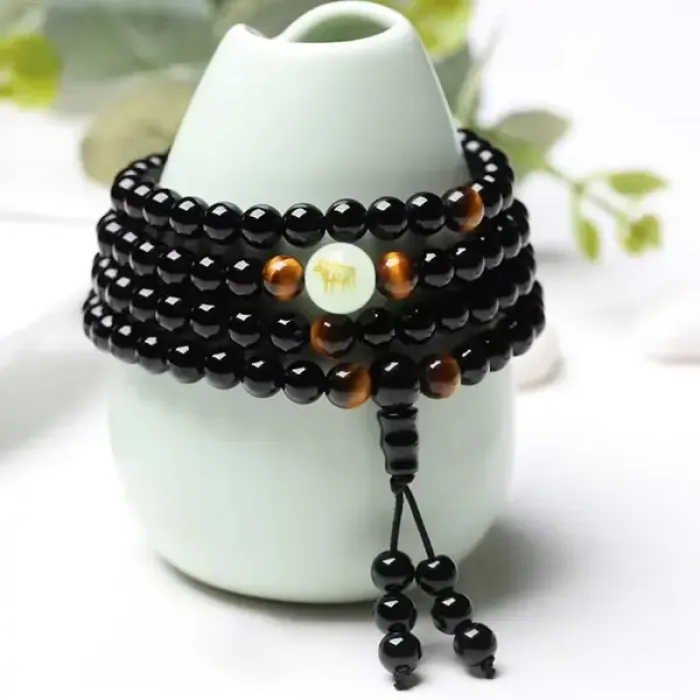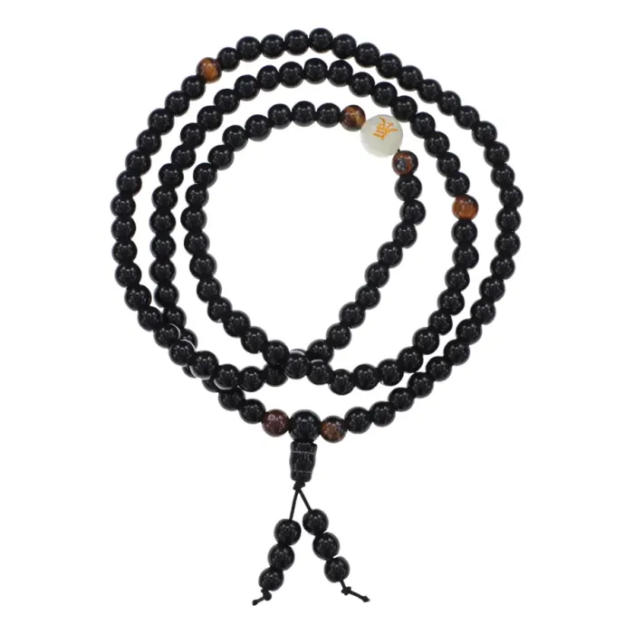 Чётки для медитации и молитвенной практики из стекла, имитирующего чёрный агат, с Гуру-бусиной.