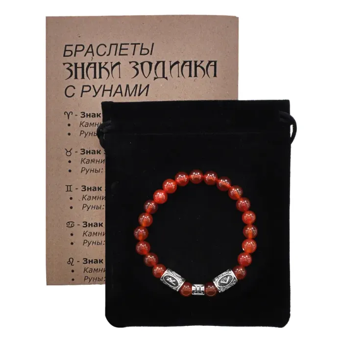 Рунический браслет со знаком зодиака Близнецы из натурального сердолика.