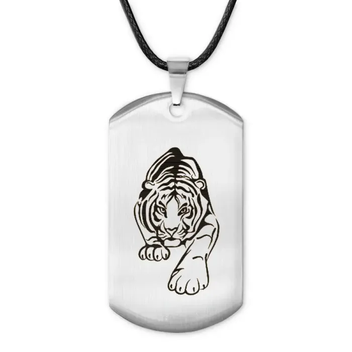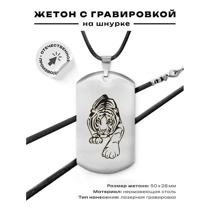 Сувенирный жетон на шнурке с изображением тигра. Изготовлен из нержавеющей стали с полированной поверхностью.
