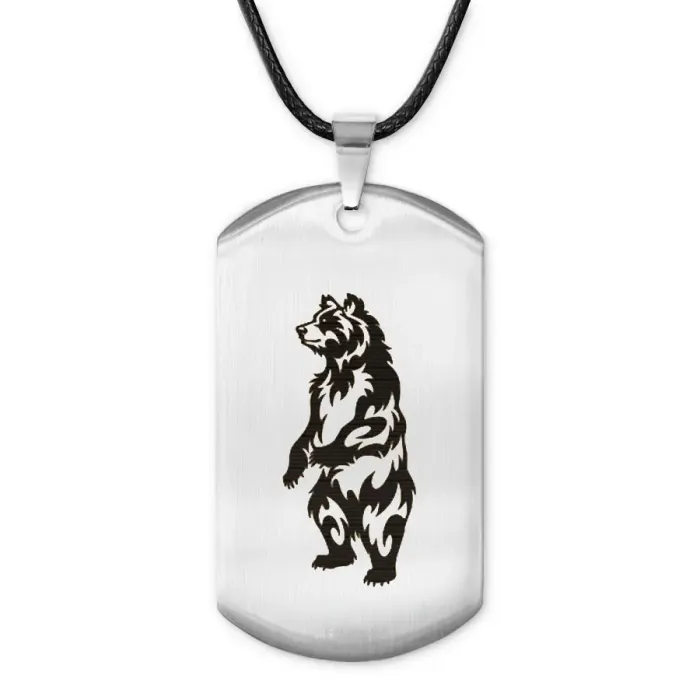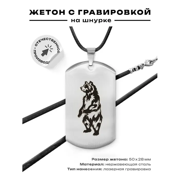 Сувенирный жетон на шнурке с изображением медведя, выполненный из нержавеющей стали с лазерной гравировкой.