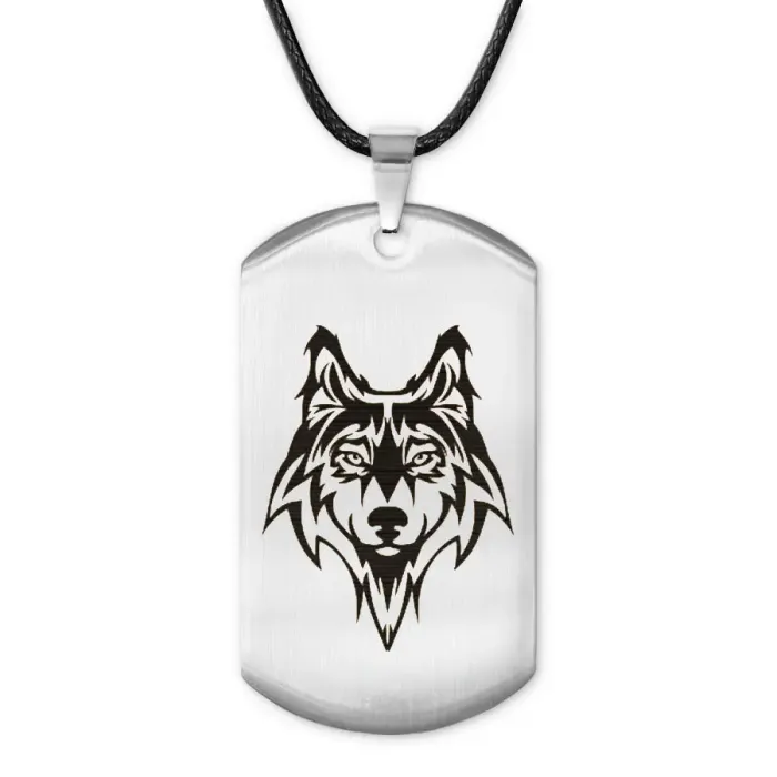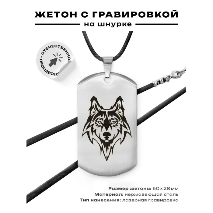 Сувенирный жетон на шнурке с изображением волка. Изготовлен из нержавеющей стали с зеркальной полировкой и лазерной гравировкой.