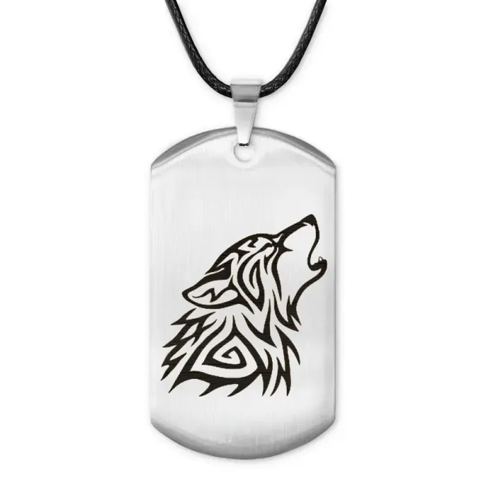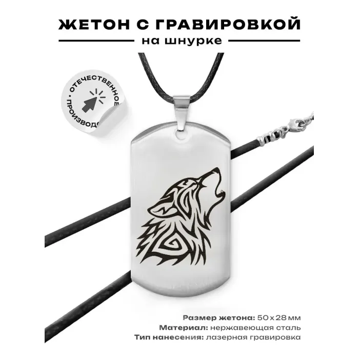 Сувенирный жетон на шнурке с изображением волка. Изготовлен из полированной нержавеющей стали с лазерной гравировкой.