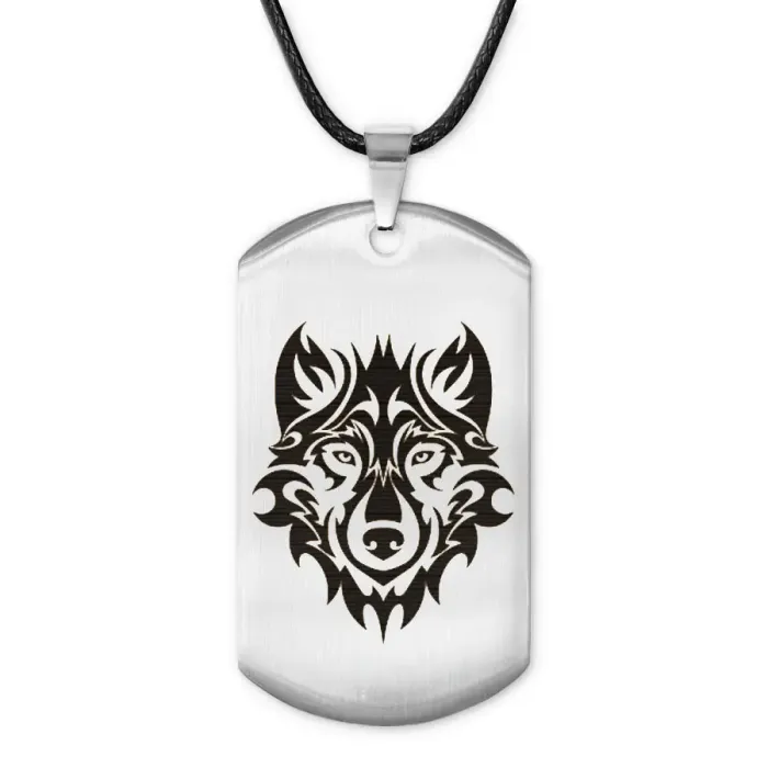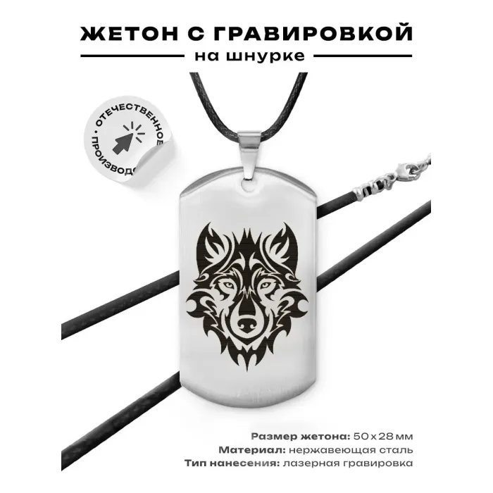 Жетон на шнурке «Волк анфас» — сувенирный амулет из полированной нержавеющей стали с лазерной гравировкой изображения волка на одной стороне.