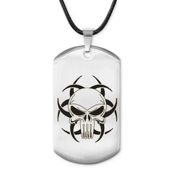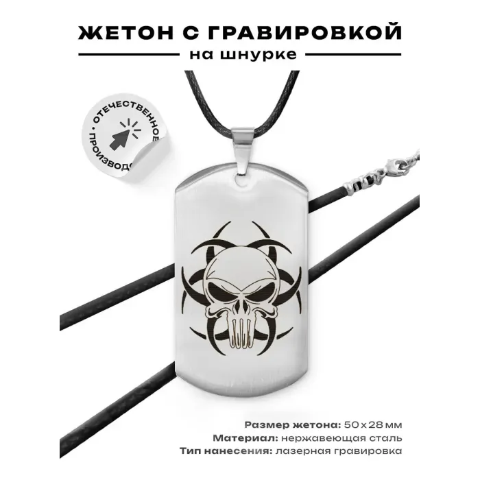 Жетон на шнурке с изображением черепа. Изготовлен из нержавеющей стали с лазерной гравировкой.