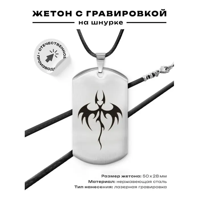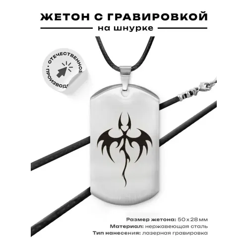 Размеры и комплектация: Размер жетона 50х28 мм. В комплекте шнурок с застёжкой. Упаковка — прозрачный пакет.
