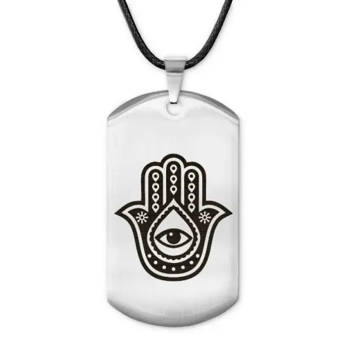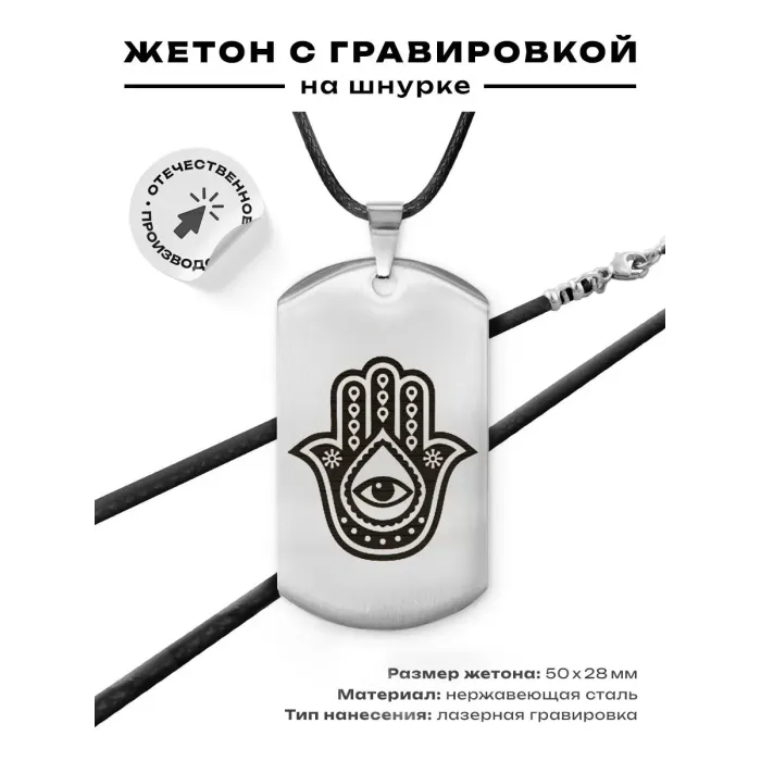 Сувенирный жетон на шнурке в виде символа Хамса (Рука Фатимы), выполненный из нержавеющей стали с зеркальной полировкой и лазерной гравировкой.