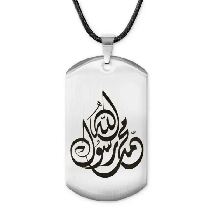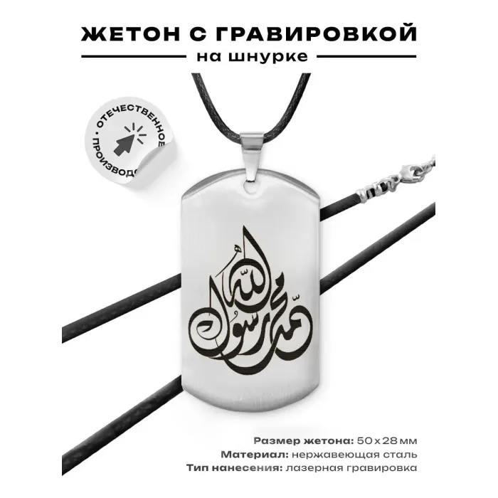 Сувенирный жетон на шнурке с надписью «Мухаммад Расулуллах» из нержавеющей стали с зеркальной полировкой и лазерной гравировкой.