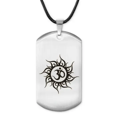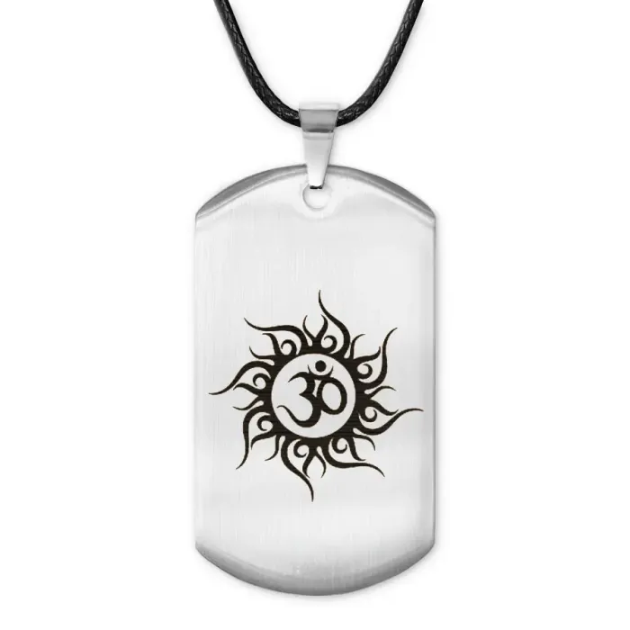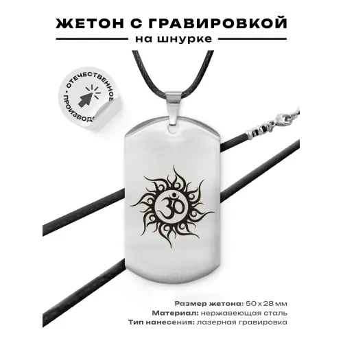 Жетон на шнурке с символом Ом, выполненный из полированной нержавеющей стали с лазерной гравировкой.