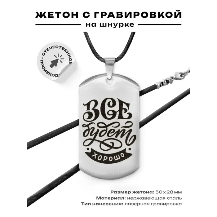 Размеры и комплектация: Размер жетона 50х28 мм. В комплекте шнурок с застежкой. Упаковка — прозрачный пакет.