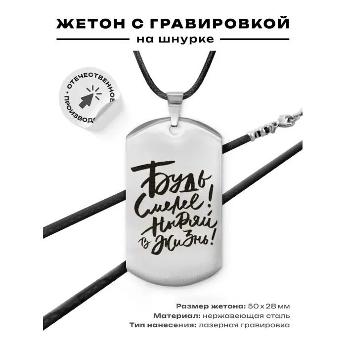 Размеры и комплектация: Размер жетона 50х28 мм. В комплект входит шнурок с застёжкой. Упаковка — прозрачный пакет.