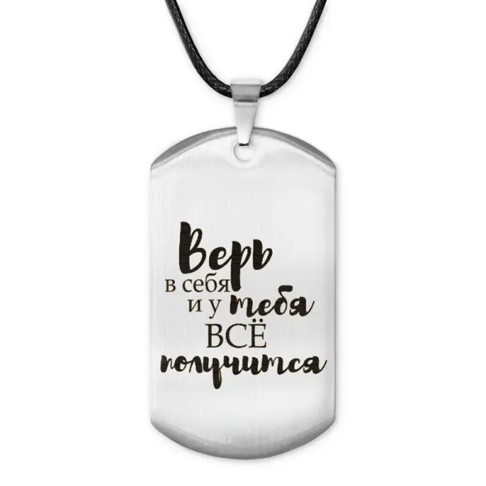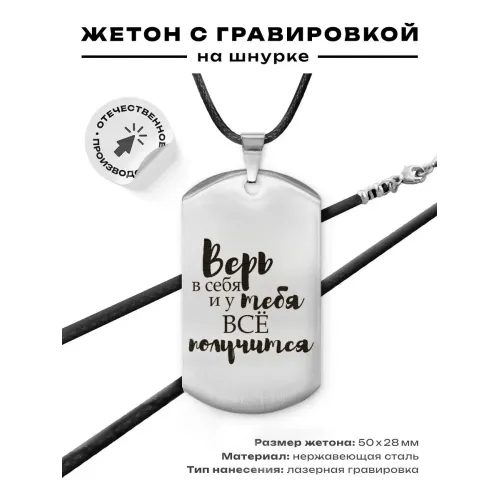 Жетон на шнурке из нержавеющей стали с лазерной гравировкой.