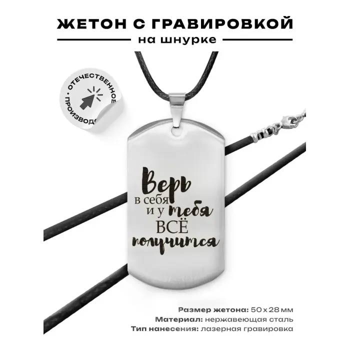 Размеры и комплектация: Размер жетона 50х28 мм. Комплектуется шнурком с застёжкой. Упаковка — прозрачный пакет.