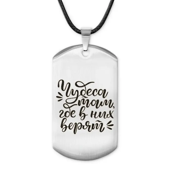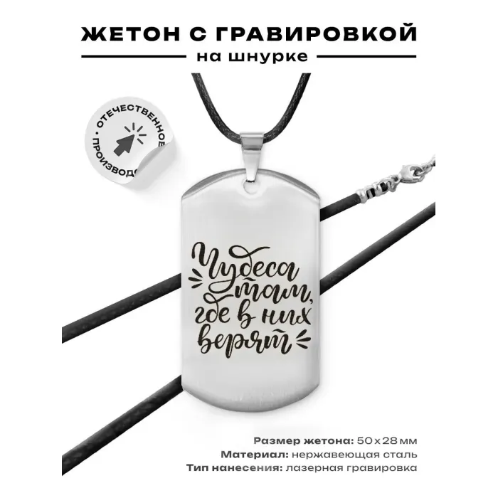 Жетон на шнурке из нержавеющей стали с зеркальной полировкой и лазерной гравировкой.
