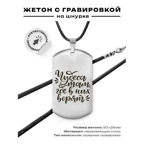 Размеры и комплектация: Размер жетона: 50х28 мм. Комплектуется прочным шнурком с застёжкой. Упаковка: прозрачный пакет.