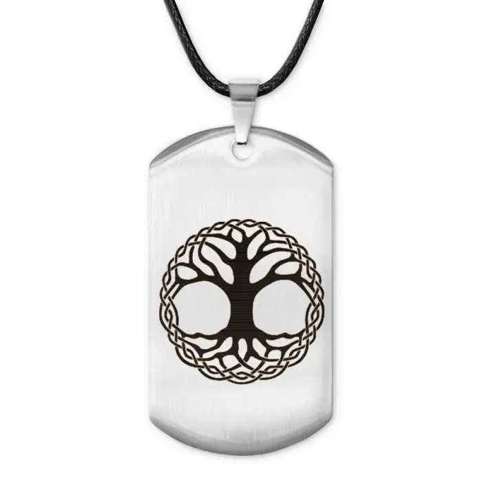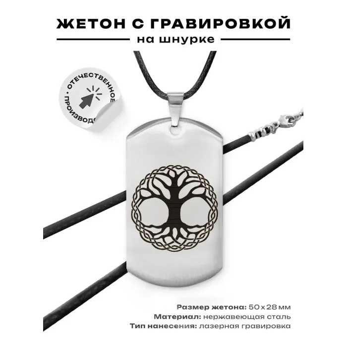 Жетон на шнурке из нержавеющей стали с лазерной гравировкой в виде дерева жизни.