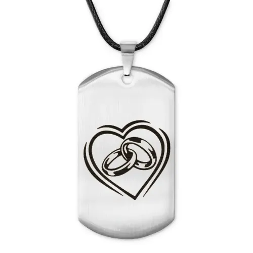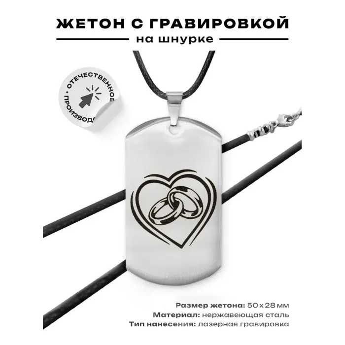 Жетон на шнурке с изображением обручальных колец. Изготовлен из нержавеющей стали с зеркальной полировкой и лазерной гравировкой.