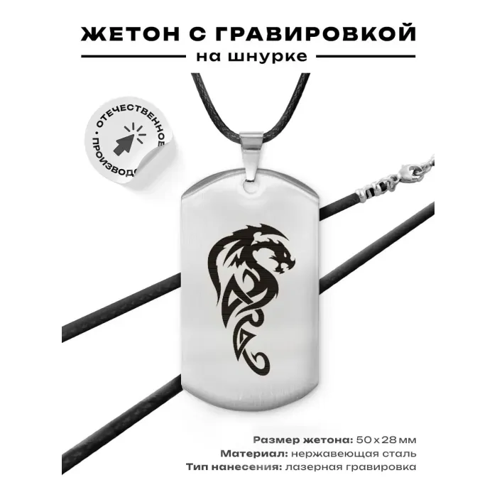 Сувенирный жетон на шнурке. Материал — нержавеющая сталь с зеркальной полировкой. Дизайн создан методом лазерной гравировки.