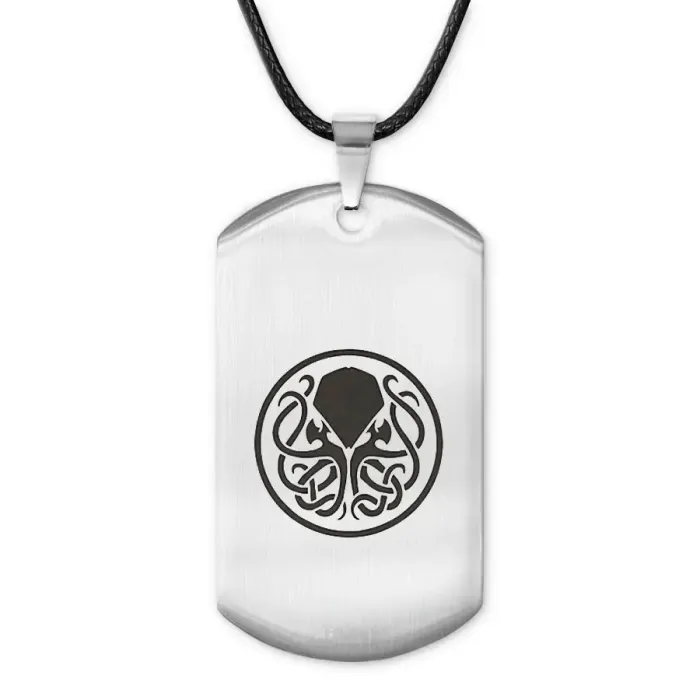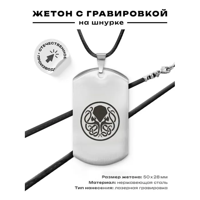 Жетон на шнурке с изображением Ктулху. Изготовлен из полированной нержавеющей стали с лазерной гравировкой на одной стороне.