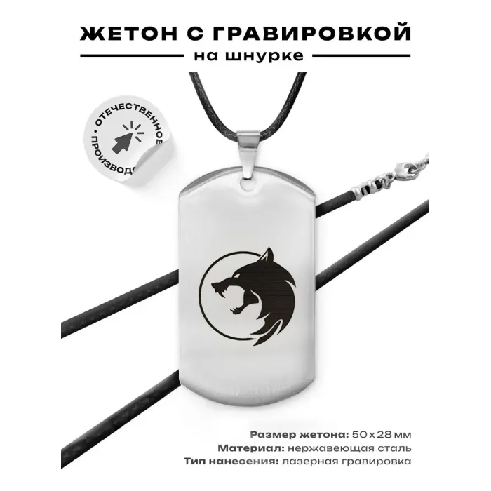 Жетон на шнурке «Волк полнолуние» — сувенирный амулет из полированной нержавеющей стали с лазерной гравировкой.