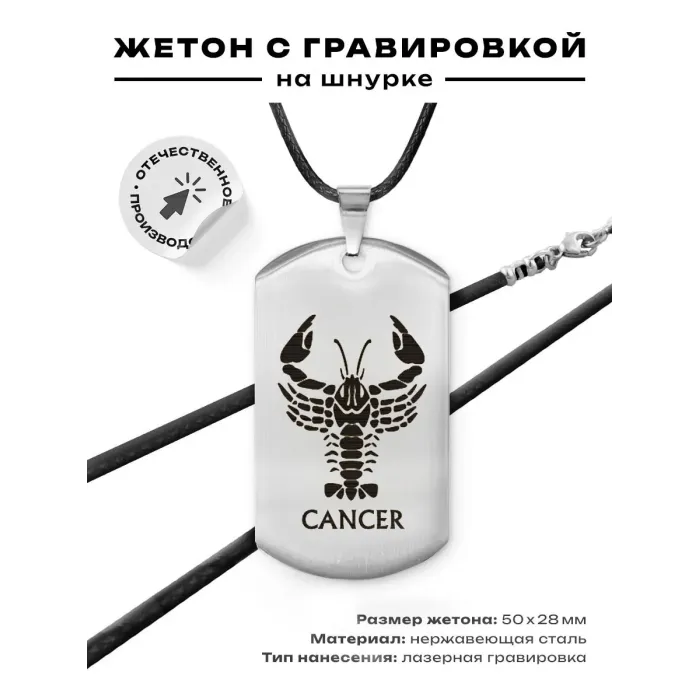 Сувенирный жетон на шнурке с изображением знака зодиака Рак. Изготовлен из нержавеющей стали с лазерной гравировкой.