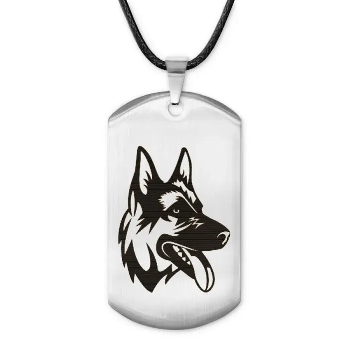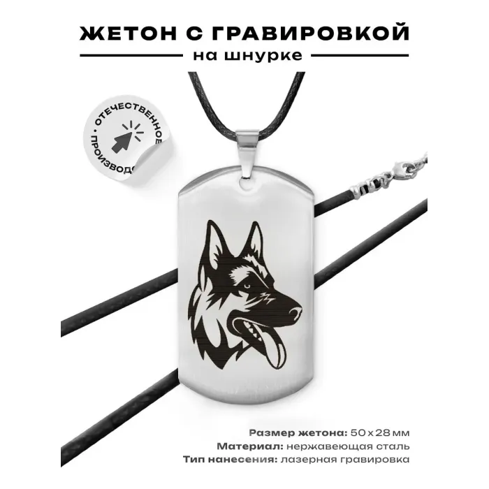 Жетон на шнурке с изображением овчарки, выполненный из нержавеющей стали.