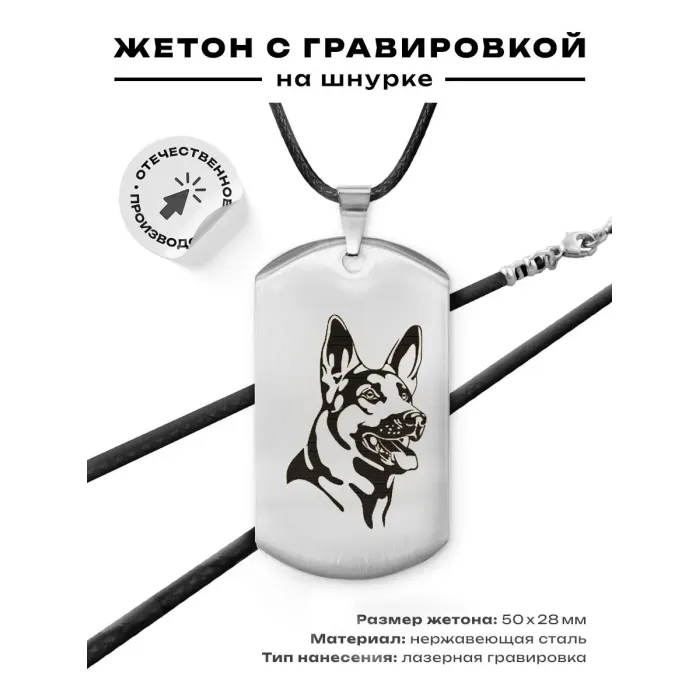 Сувенирный жетон на шнурке с портретом овчарки. Изготовлен из нержавеющей стали с зеркальной полировкой и лазерной гравировкой.