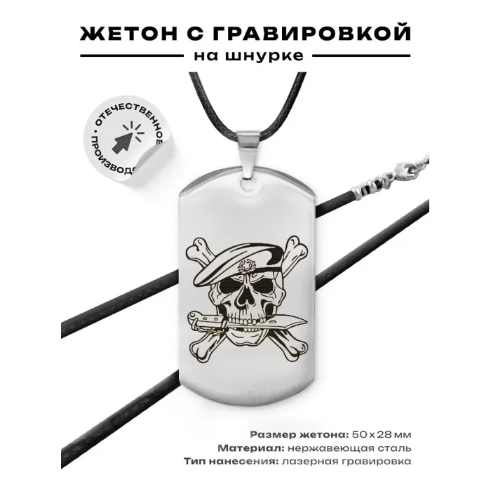 Жетон на шнурке Череп в берете — это стильный амулет, выполненный из высококачественной нержавеющей стали с зеркальным блеском. Лазерная гравировка создает эффектное изображение черепа, которое добавляет характер и индивидуальность. Размер жетона составляет 50х28 мм, что делает его удобным для ношения. В комплект входит прочный шнурок с застёжкой, обеспечивающий надежную фиксацию. Упаковка в прозрачный пакетик позволяет сохранить изделие в идеальном состоянии до момента использования.