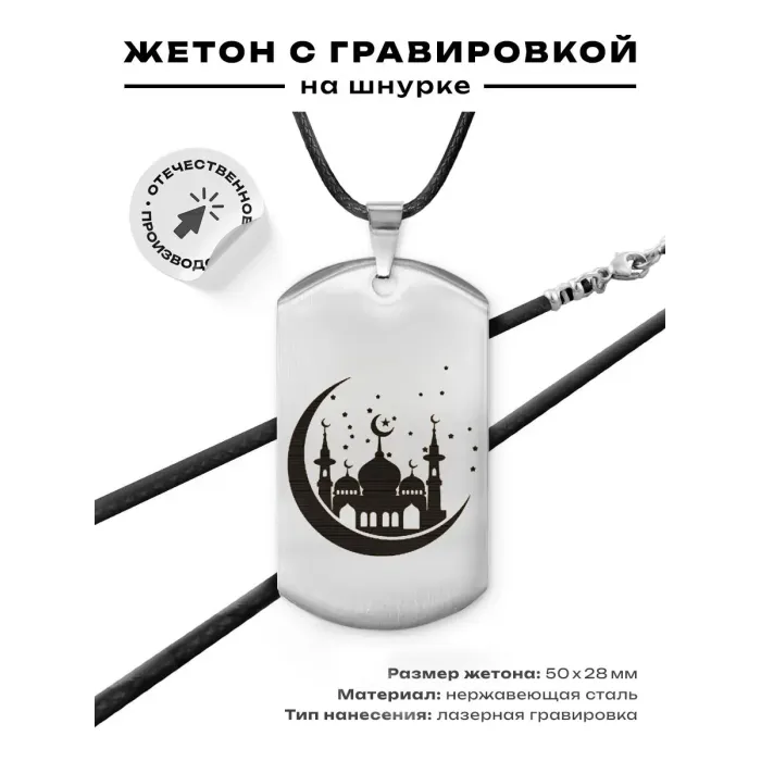 Сувенирный жетон из нержавеющей стали с лазерной гравировкой в виде мечети и полумесяца на шнурке.
