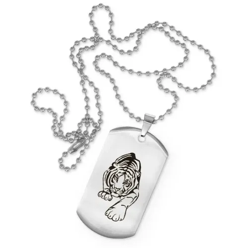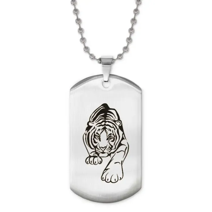 Сувенирный жетон на цепочке с изображением тигра. Изготовлен из нержавеющей стали с зеркальной полировкой и лазерной гравировкой.