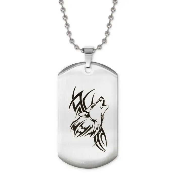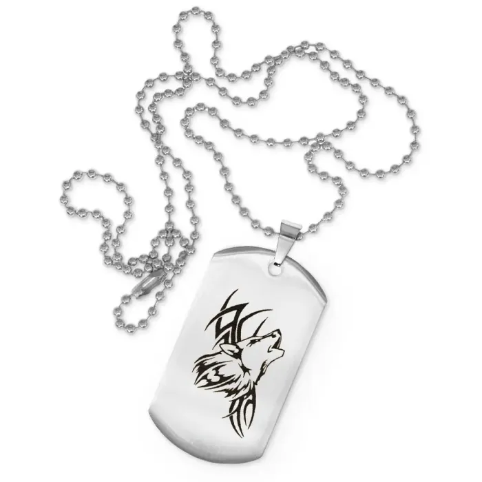 Сувенирный жетон на цепочке с изображением волка. Изготовлен из нержавеющей стали с зеркальной полировкой и лазерной гравировкой.