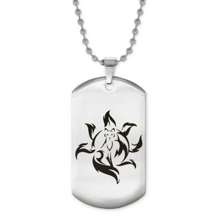 Сувенирный жетон на цепочке с изображением Кицунэ. Изготовлен из нержавеющей стали с зеркальной полировкой и лазерной гравировкой.