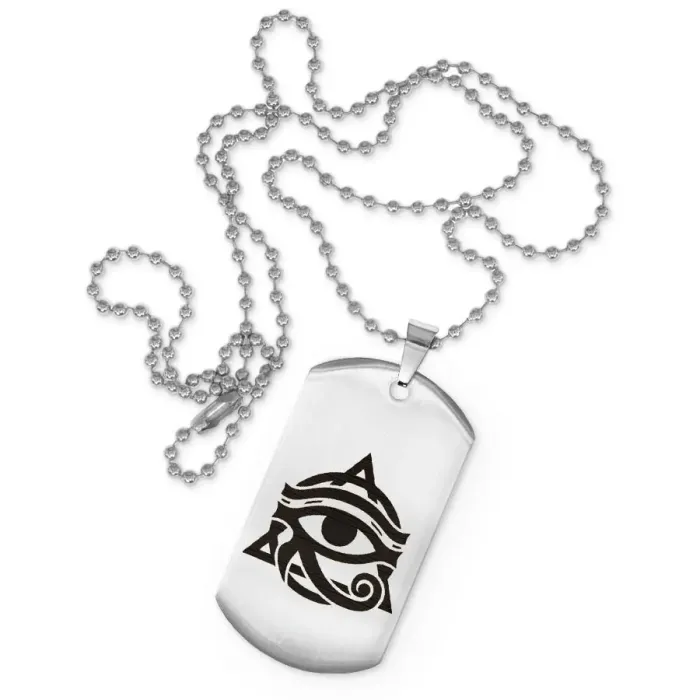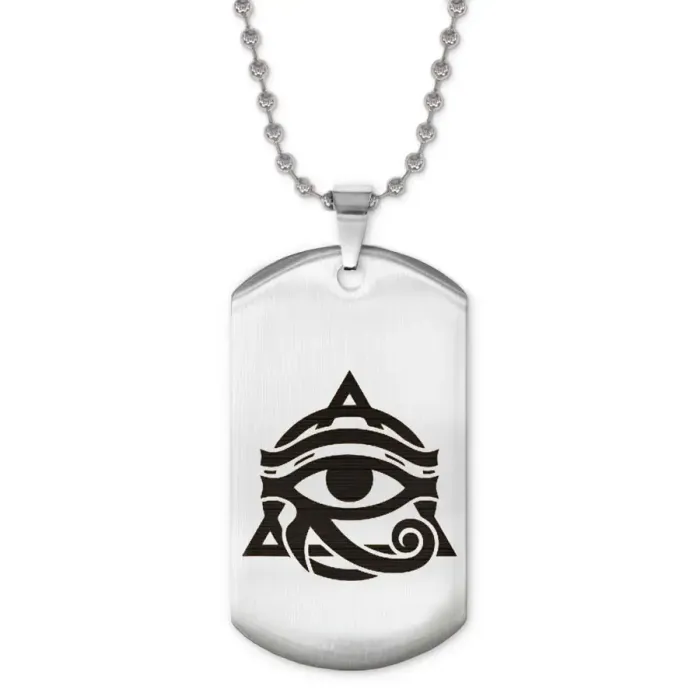 Сувенирный жетон на цепочке «Око Ра». Изготовлен из нержавеющей стали с полированной поверхностью и лазерной гравировкой.