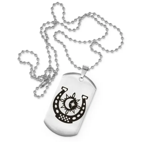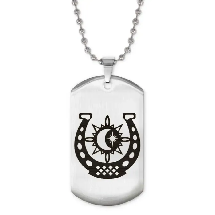 Жетон на цепочке с лазерной гравировкой в виде подковы, солнца и луны. Изготовлен из полированной нержавеющей стали.