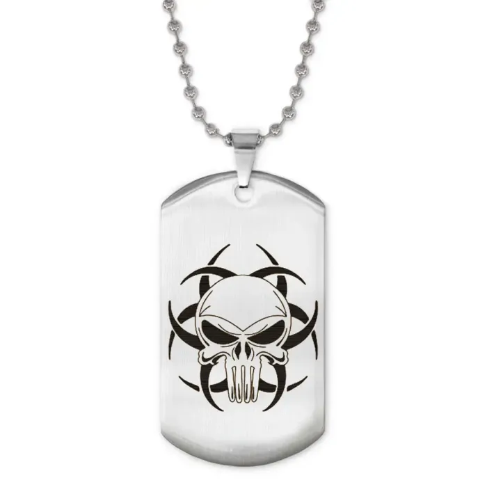 Жетон на цепочке из нержавеющей стали с лазерной гравировкой в виде черепа и символа Biohazard.