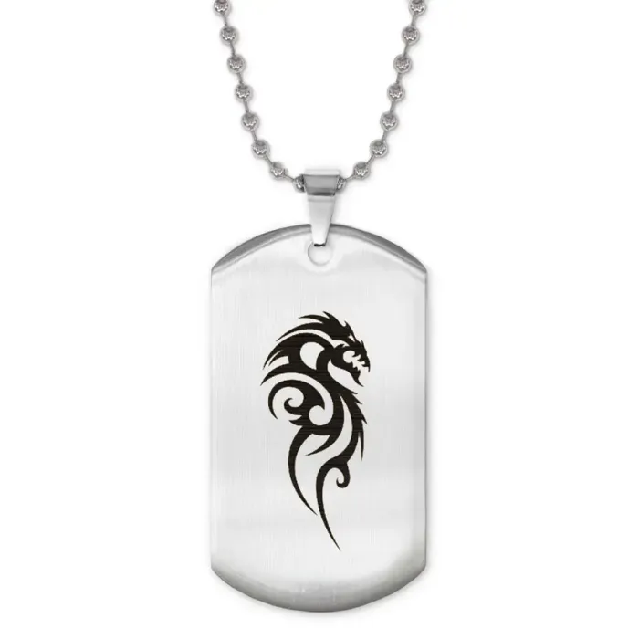 Жетон на цепочке с изображением дракона, выполненным методом лазерной гравировки.
