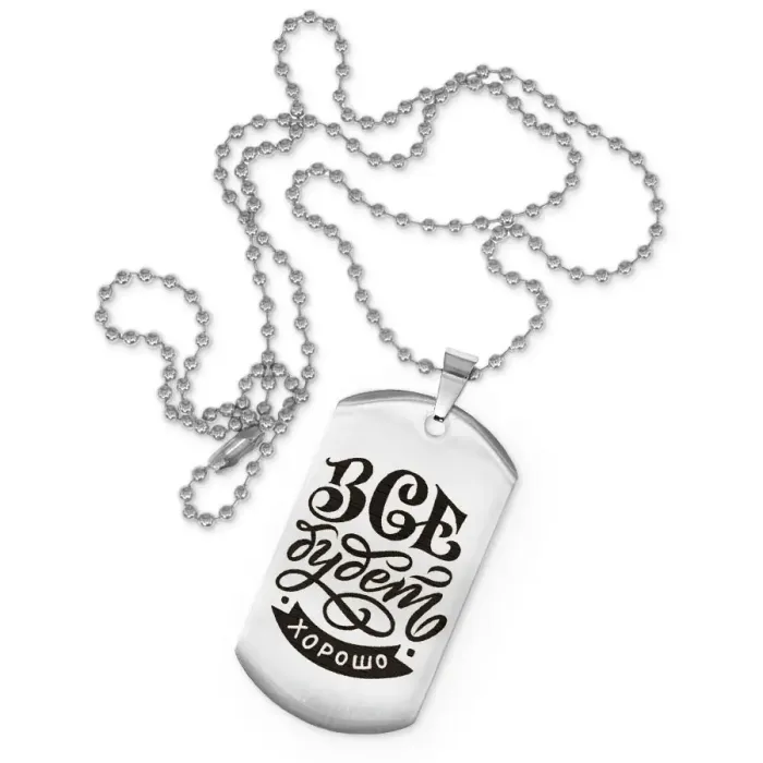 Жетон на цепочке с позитивной надписью. Изготовлен из нержавеющей стали с зеркальной полировкой и лазерной гравировкой.