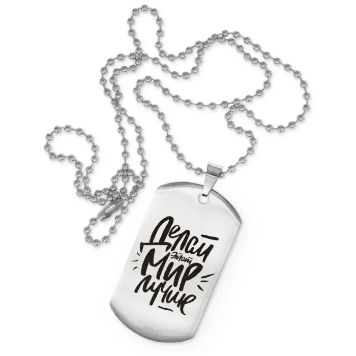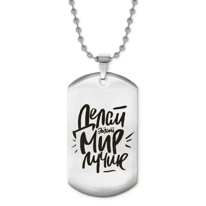 Жетон на цепочке с лазерной гравировкой фразы «Делай этот мир лучше». Изготовлен из нержавеющей стали.