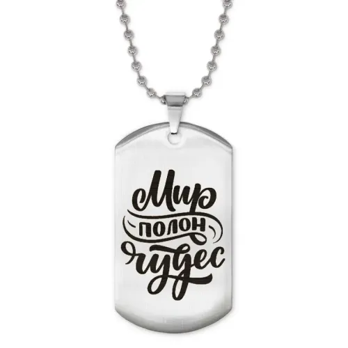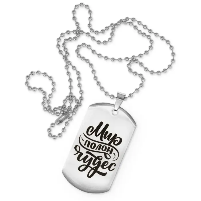 Размеры и комплектация: Размер жетона: 50x28 мм. Длина цепочки: 60 см, регулируемая. Упаковка: прозрачный пакет.