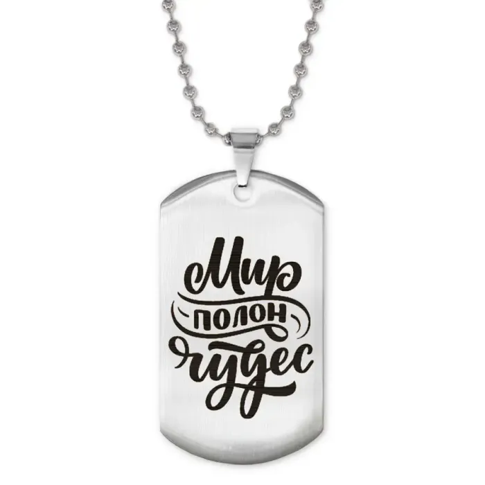 Сувенирный жетон на цепочке с лазерной гравировкой. Материал — нержавеющая сталь с зеркальной полировкой.