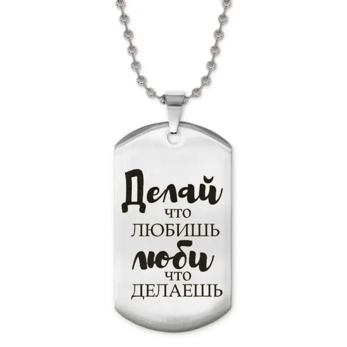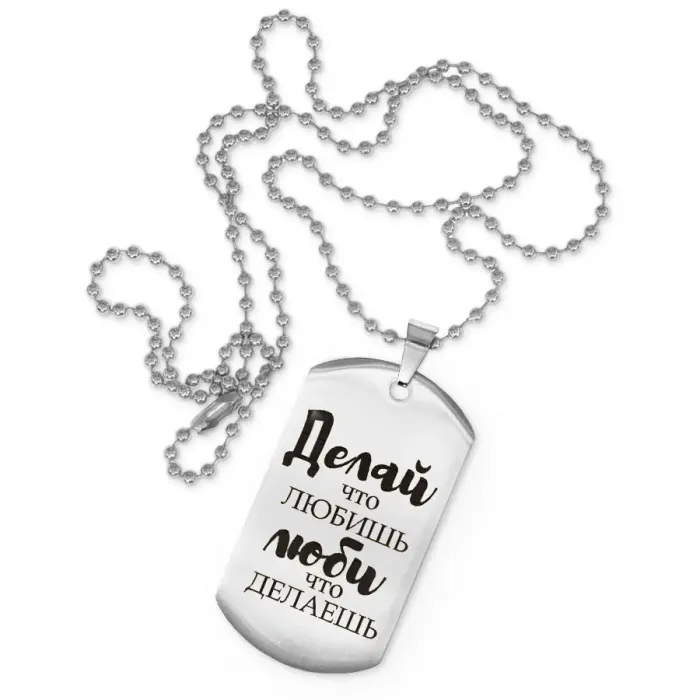 Жетон на цепочке с лазерной гравировкой надписи "Делай, что любишь". Материал — нержавеющая сталь.