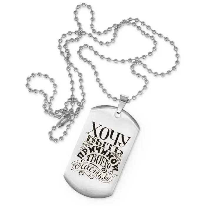 Размеры и комплектация: Размер жетона: 50x28 мм. Длина цепочки: 60 см (регулируемая). Упаковка: прозрачный пакет.
