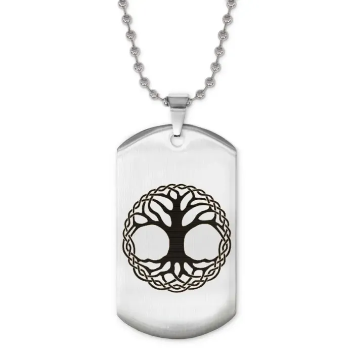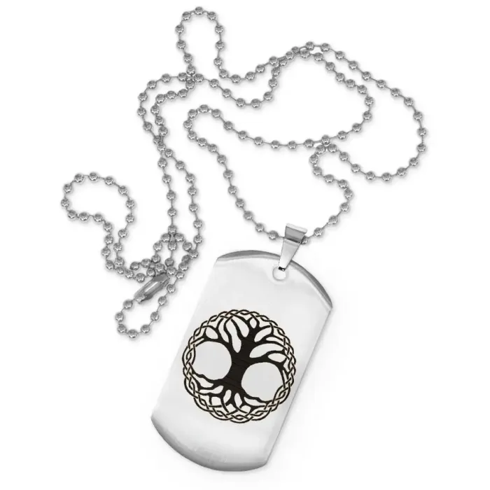 Сувенирный жетон на цепочке с изображением дерева жизни. Изготовлен из нержавеющей стали с зеркальной полировкой и лазерной гравировкой.