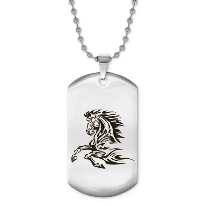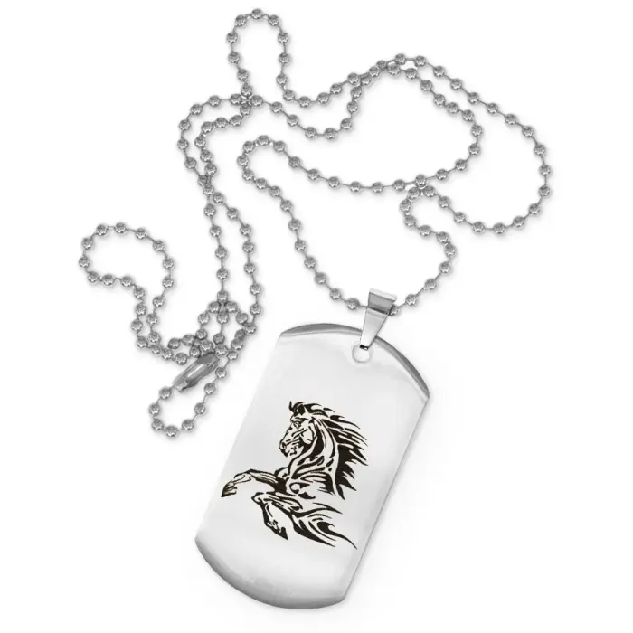 Сувенирный жетон на цепочке с изображением жеребца. Изготовлен из полированной нержавеющей стали с лазерной гравировкой.