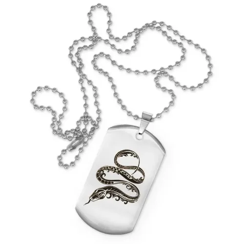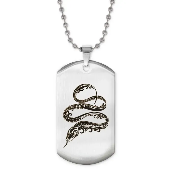 Сувенирный жетон на цепочке с изображением змеи. Изготовлен из нержавеющей стали с зеркальной полировкой, рисунок нанесён лазерной гравировкой.