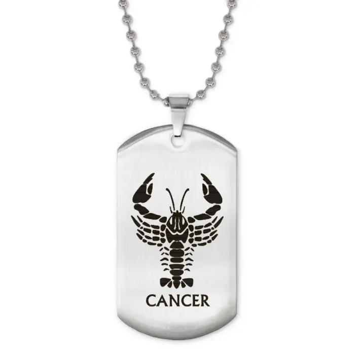 Сувенирный жетон на цепочке с изображением знака зодиака Рак. Изготовлен из нержавеющей стали с зеркальной полировкой и лазерной гравировкой.