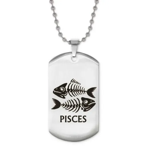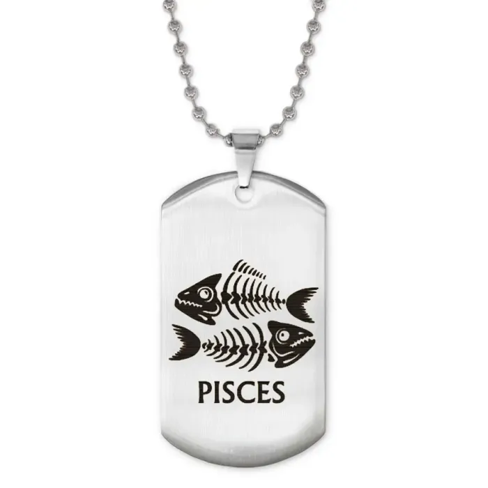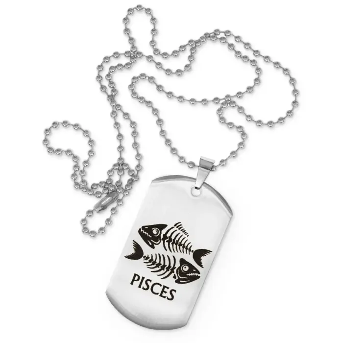 Сувенирный жетон на цепочке с изображением знака зодиака Рыбы. Изготовлен из нержавеющей стали с зеркальной полировкой и лазерной гравировкой.