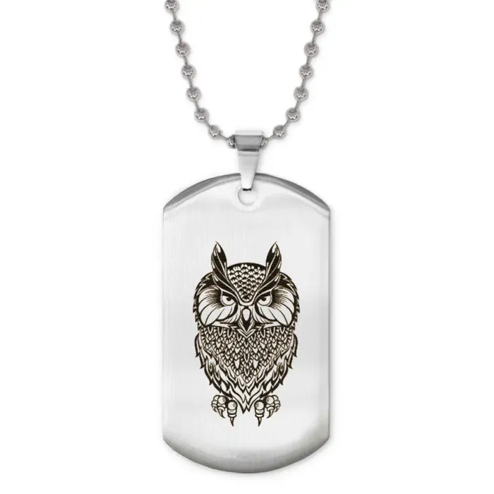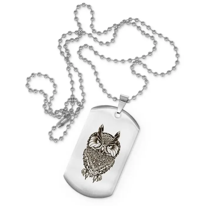 Жетон на цепочке с изображением совы. Изготовлен из нержавеющей стали, украшен лазерной гравировкой.