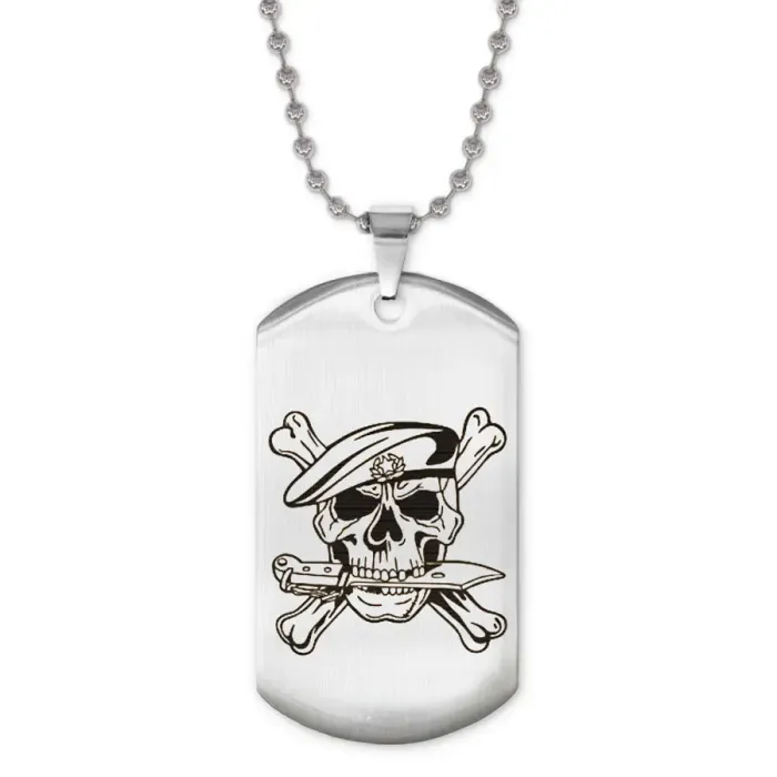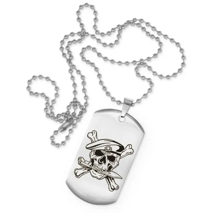 Жетон на цепочке с изображением черепа в берете. Изготовлен из нержавеющей стали с зеркальной полировкой.